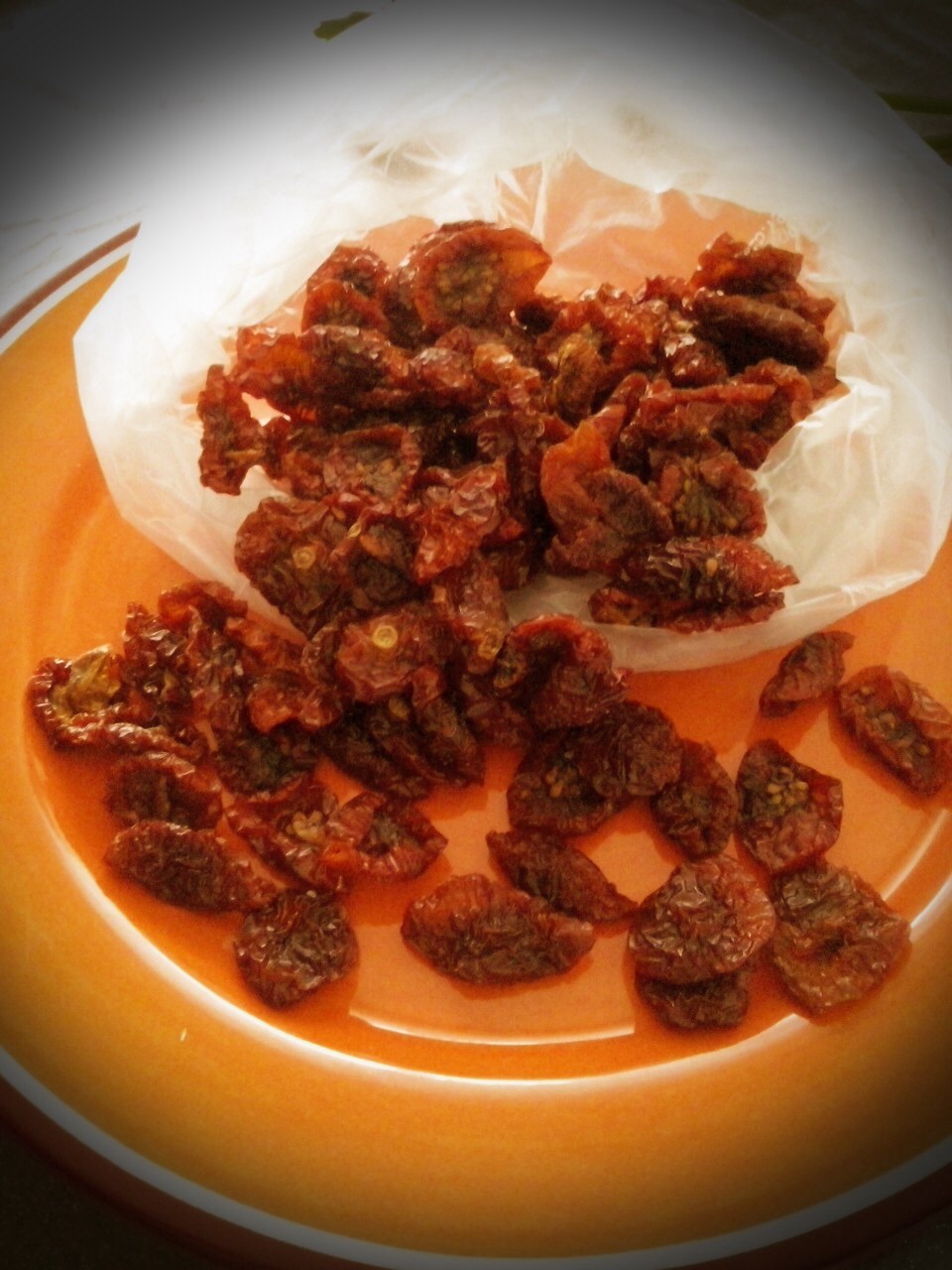Se proprio ci vogliamo provare dobbiamo comprare dei pomodori freschi, tipo ramato belli densi e duri ma maturi. Lavarli, tagliarli a metá e stenderli al sole con del sale grosso sopra per almeno 5-6 gg a seconda del clima e del sole e del caldo. Il sale fará fuoriuscire l’acqua di vegetazione e il sole li asciugherà. Noterete che se avete comprato 1 kg di pomodori freschi il peso da secco sarà più che dimezzato lasciandovi un po’ delusi perché per riempire una boccetta sott’olio bisogna davvero faticare tanto!