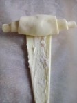 A questo punto dedichiamoci alla forma. Impugnate un coltello o una rotella e zac…disegnamo sfruttando il più possibile la pasta. Io compro la pasta sfoglia già pronta formato rettangolare. Divido in due parti uguali la sfoglia e per ciascun pezzo taglio la pasta a triangoli, vicini tra loro. Disegno circa 12 triangoli a rotolo. Con un cucchiaino stendiamo le nostre creme proprio alla base dei triangoli e da li arrotoliamo fino alla punta. Ecco fatto! Sigillate le due estremità facendo una leggera pressione, spennellate con del tuorlo sbattuto. Pronti per il forno: 200 gradi.