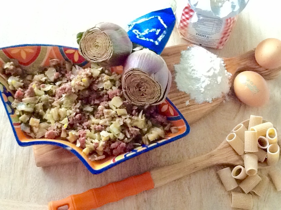 Procedure: clean and cut in two same part artichokes. Remove the hay, put in a bowl with water and lemon, so don’t become dark. Cut them into small pieces and also use stems (will be peeled). Cook them with oil and a clove of garlic. Add water to allow good cooking and add the sausage deprived of the gut. so will evaporate the combination of flavors and the smell of fennel seeds. Finish cooking with the lid and ensure a certain humidity adding too much water.