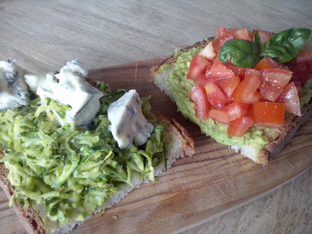 Ingredienti: pane tagliato a fette, meglio se di grano duro, 1 avocado, succo di limone,300 gr di pomodori maturi, 2 zucchine, 150 gr di gorgonzola piccante, sale, olio q.b., basilico e aglio