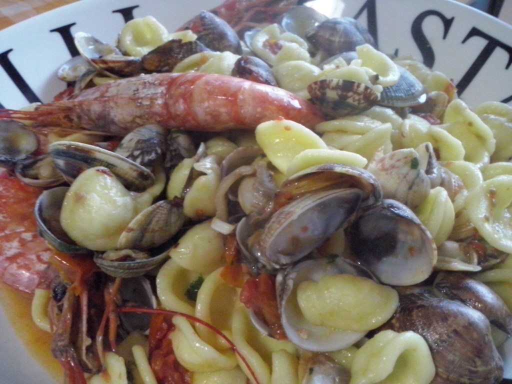 Ingredienti per 2 persone: una rete di vongole veraci, 6 gamberoni, 5-6 pomodorini, olio evo, 1 spicchio d’aglio, peperoncino, 180 gr di orecchiette, prezzemolo.