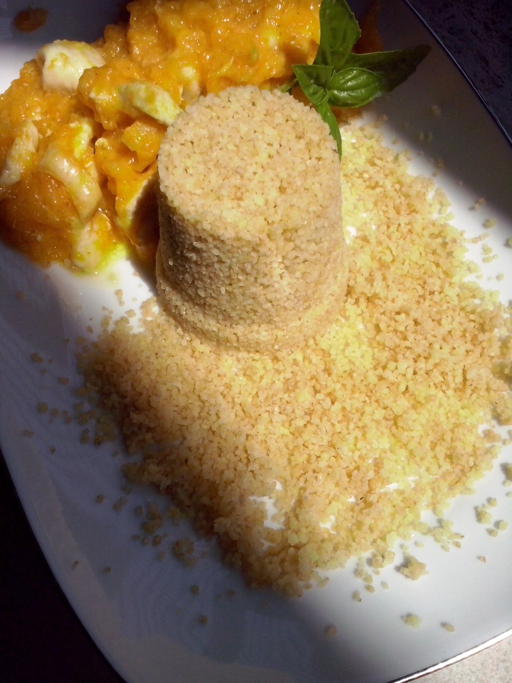 Ingredients: 4 slices of breast polllo, 1 teaspoon curry, a slice of pumpkin (about 80-100 grams), a few slices of leek, a cup of fresh cream, extra virgin olive oil to taste, couscous spelled;