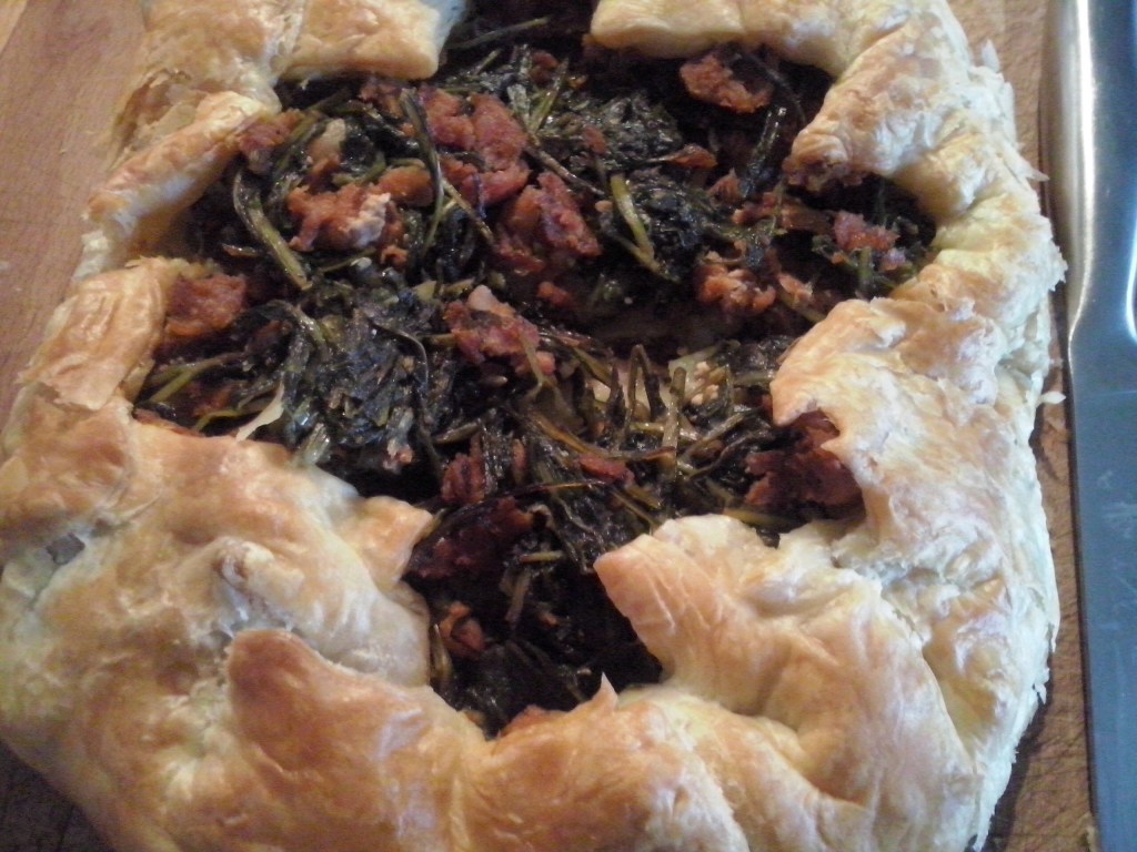 Ingredienti: 1 rotolo di pasta sfoglia già pronta, 200 gr di cicorie, 200 o più gr di salsicia con semi di finocchio e peperoncino, 2 patate di medie dimensioni, un po’ di latte per spennelare la sfoglia, olio evo e sale q.b.