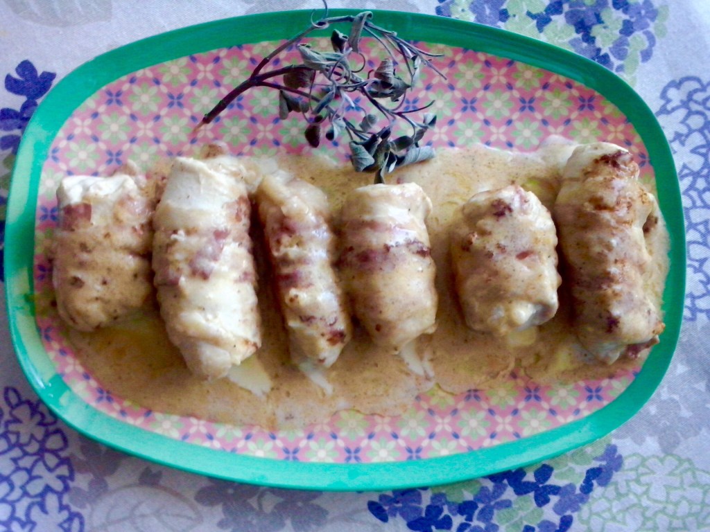 Ingredients for 4 people: 4 large slices of turkey breast, 4 slices of sottiletta cheese, 30 gr. butter, 8 slices of bacon, 1 teaspoon of flour, salt to taste aromatic for meat (You can use also powdered sage, thyme, rosemary), water as needed;