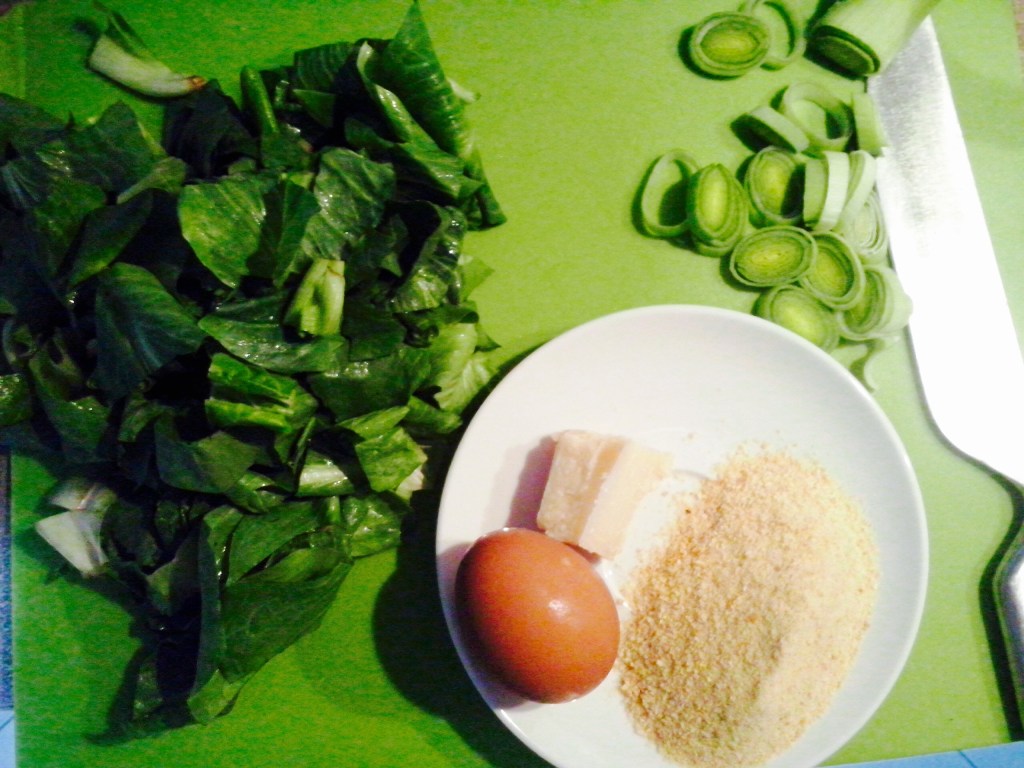 Ingredienti: 2 uova, 300 gr di “cicorino” in foglie, 50 gr. di porro, 20 gr. di parmigiano grattugiato, pan grattato q.b., sale e olio evo q.b.;