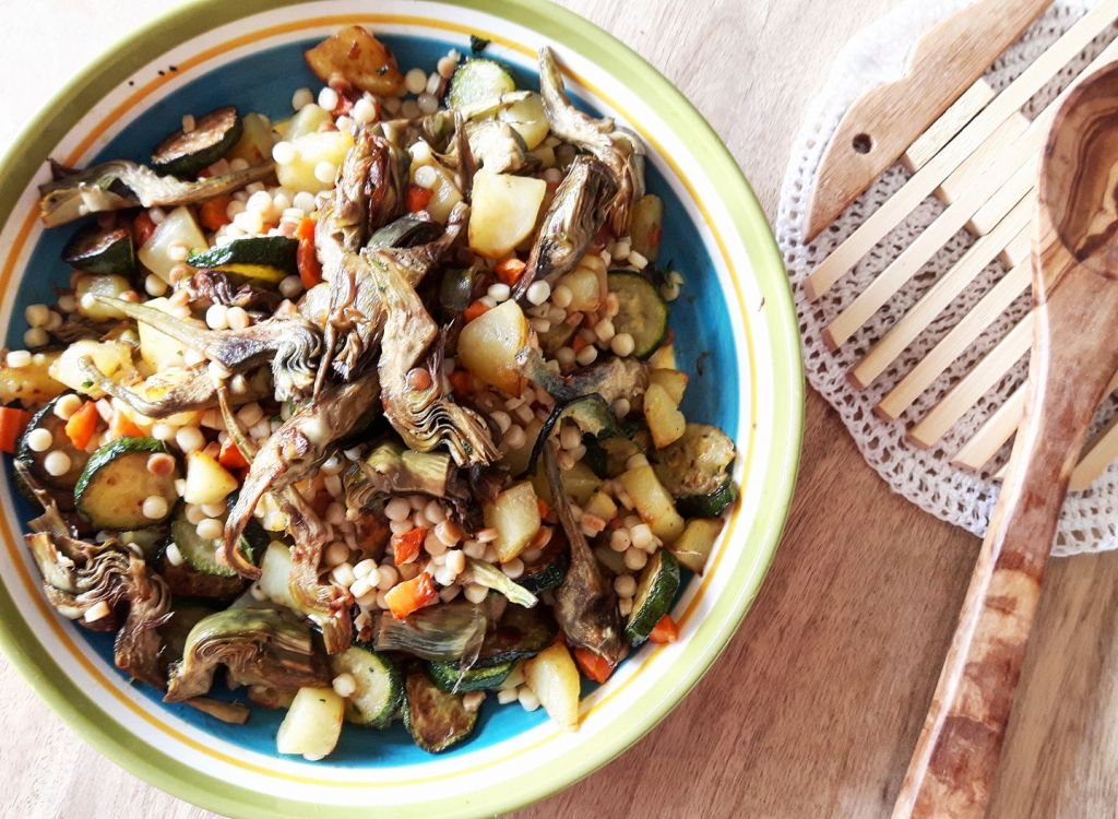 Ingredienti: 250 gr di fregola sarda, zucchine, carote, carciofi, peperoni, cipolla, qualche foglia di basilico e pinoli.